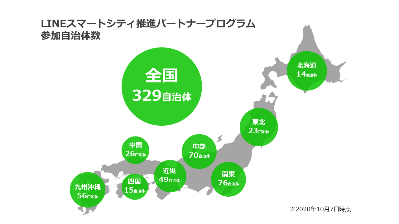 LINE株式会社(所在地:東京都新宿区、代表取締役社長:出澤剛)は、コーポレートミッションである「CLOSING THE DISTANCE」のもと、住民と行政の距離を縮め、住民にとってより利便性の高い行政サービスの提供や、自治体職員の業務効率化を実現するため、自治体のスマートシティ化を推進する「LINEスマートシティ推進パートナープログラム」を2020年7月21日に創設しました※。その後、全国の自治体へプログラムへの参加を呼びかけ、参加の一次申込み締切日である昨日までに329自治体が参加したことをお知らせします。