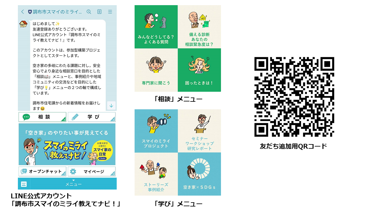 調布市では、全国的な社会問題となっている空き家問題にLINEを活用して取り組むため、LINE公式アカウント「調布市スマイのミライ教えてナビ!」を10月1日に開設しました。このアカウントでは、空き家化を未然に防ぐため、持ち家に関する困りごとなどを抱える住民が住宅の専門家等に気軽に相談できるメニューや、空き家の活用方法について学べるメニューなどが利用できます。