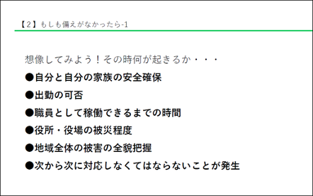 [職員として稼働できるまでの時間]公共交通機関はストップしており、火災や建物の倒壊で道路もいつもどおりに移動できるとは限りません。庁舎に参集できる人とリモート対応する人などのルールを事前に決めておかなければうまく回りません。