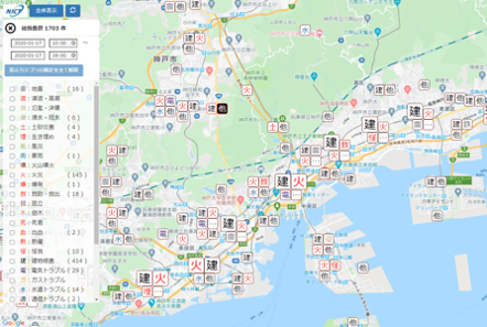 この図は、2020年に神戸市で実施されたチャットボットを使った実証実験の結果です。建物倒壊、火災、水道トラブルなど、各地にいる住民や職員から続々と届く被災情報により、災害対策本部ではいながらにして災害被害状況のマップが手に入り、迅速で的確な判断につながります。